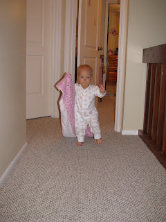 I have cracked up this week watching Laurel chat on the "telephone". She rarely gets to push buttons on the real phone (for fear she may really call someone). When she does find the phone she is delighted and wants to push all the buttons, of course. Thankfully I hear them beeping before she's called China. She gets extremely upset when mommy doesn't let her complete the call and use her jibberish. I finally got tired of hearing her scream after taking the phone away so I substituted it with the DVD remote. She immediately held it up to her ear and said "Dada? Dada?" I said, "say hi to Dada"--she waved her little hand. I'm glad to see she is using her imagination already. If it can be held up to her ear, she is currently using it as a phone and begins chatting...I'm sure she has observed me chat on the phone....Monkey see...Monkey do.